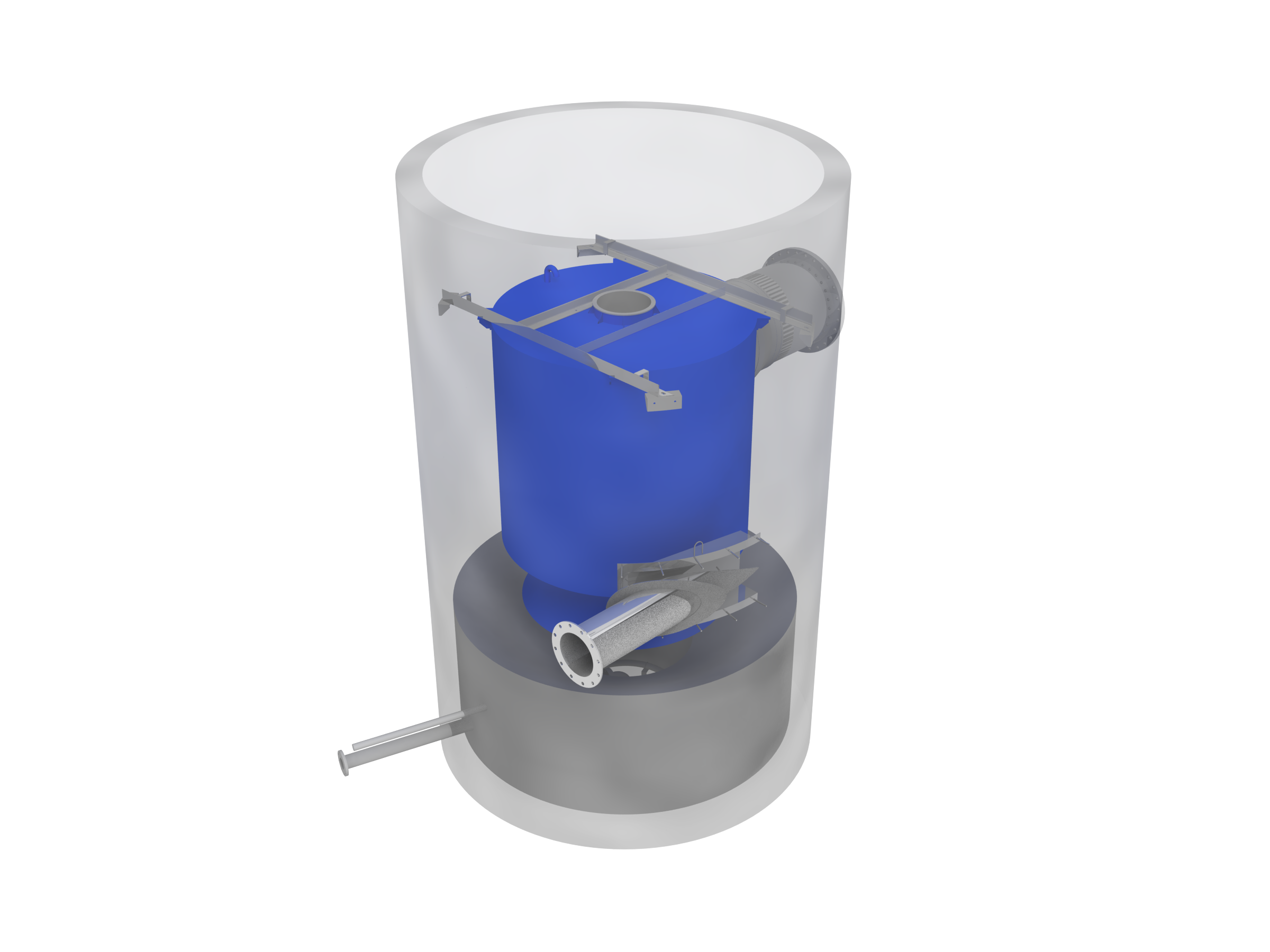 Flow is introduced via a tangential inlet causing a rotational flow path around the dip plate. The flow spirals down the wall of the chamber as solids settle by gravitational forces as well as forces created by the rotating flow. The grit collects in the grit sump at the bottom of the unit as the center cone directs flow away from the base, up and around the center shaft into the inside of the dip plate and out the effluent pipe. The concentrated grit underflow is pumped to a Decanter or SpiraSnail® Compact unit.