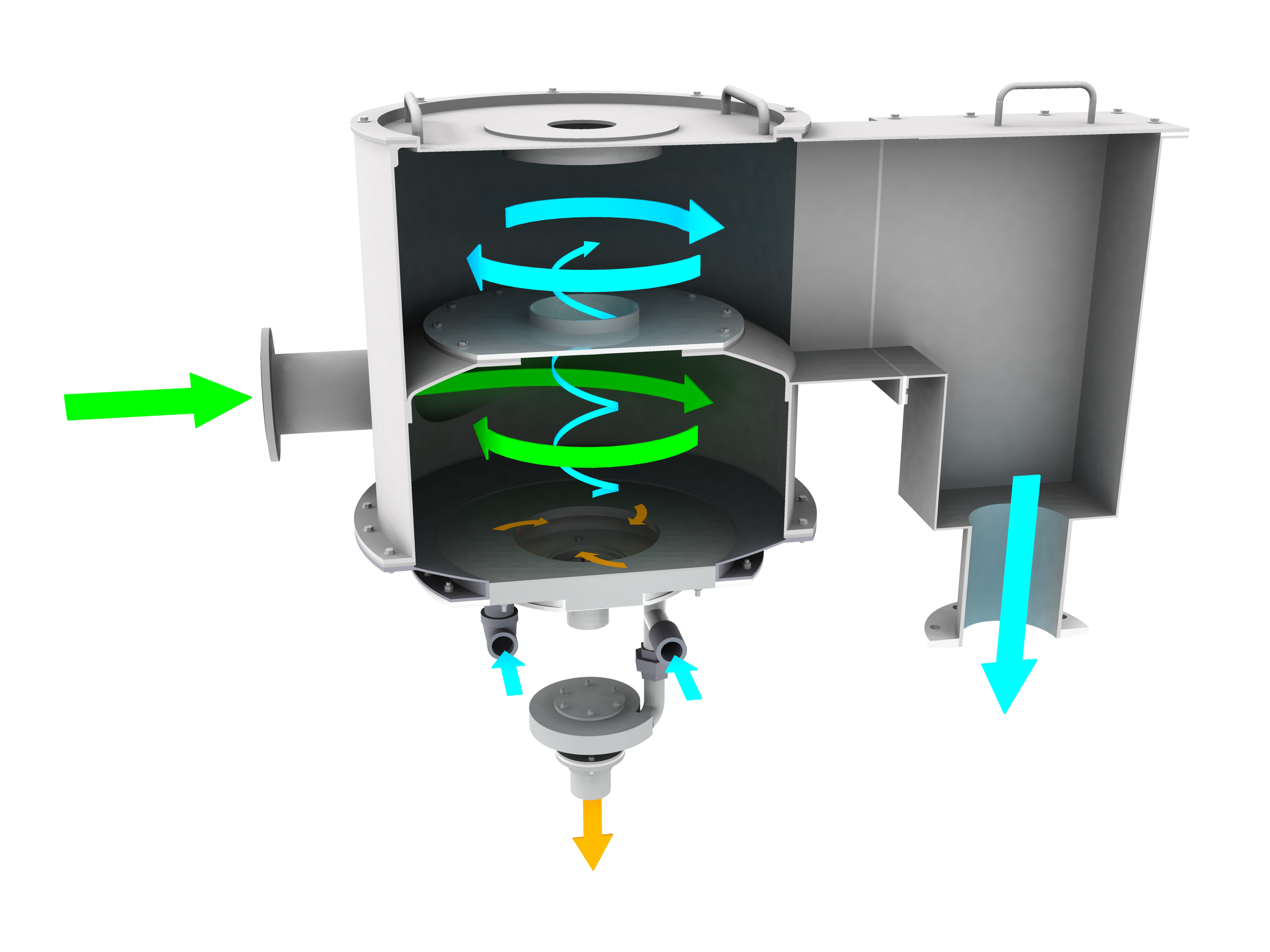 The SlurryCup™ uses a combination of an open free vortex and the accelerated gravity boundary layer effect to capture, classify, and remove fine grit, sugar sand, and high density fixed solids from grit slurries, and both primary and secondary sludge.