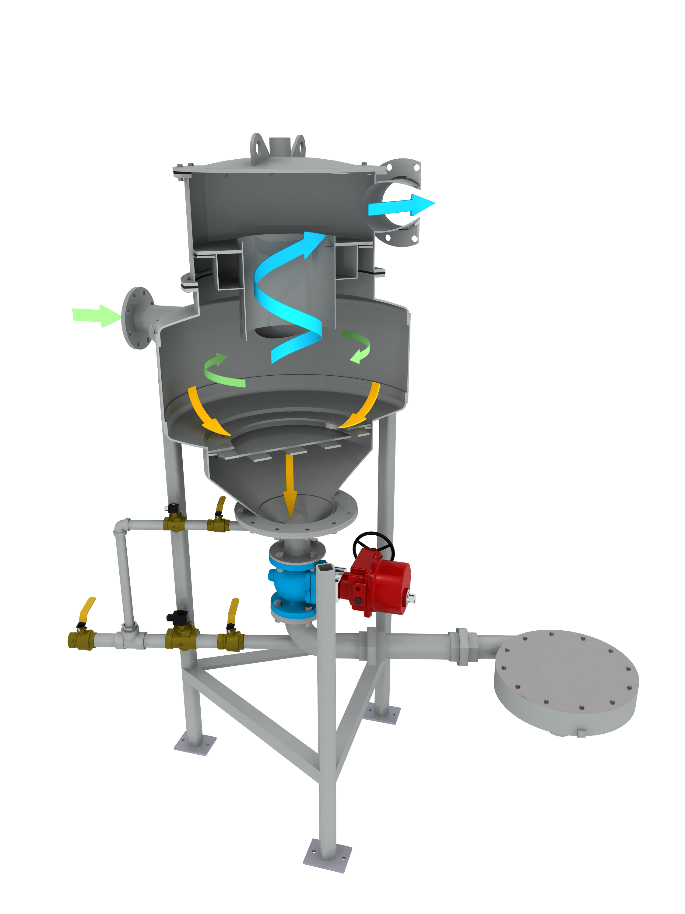Flow enters the stainless steel vessel tangentially at a controlled rate and velocity. The flow regime established in the device forms a free vortex which results in high centrifugal forces and a thin predictable boundary layer. Grit is forced to the outside perimeter or held in suspension until it falls by gravity into the boundary layer which sweeps the grit, but not volatile solids, into the collection chamber at the bottom of the unit.