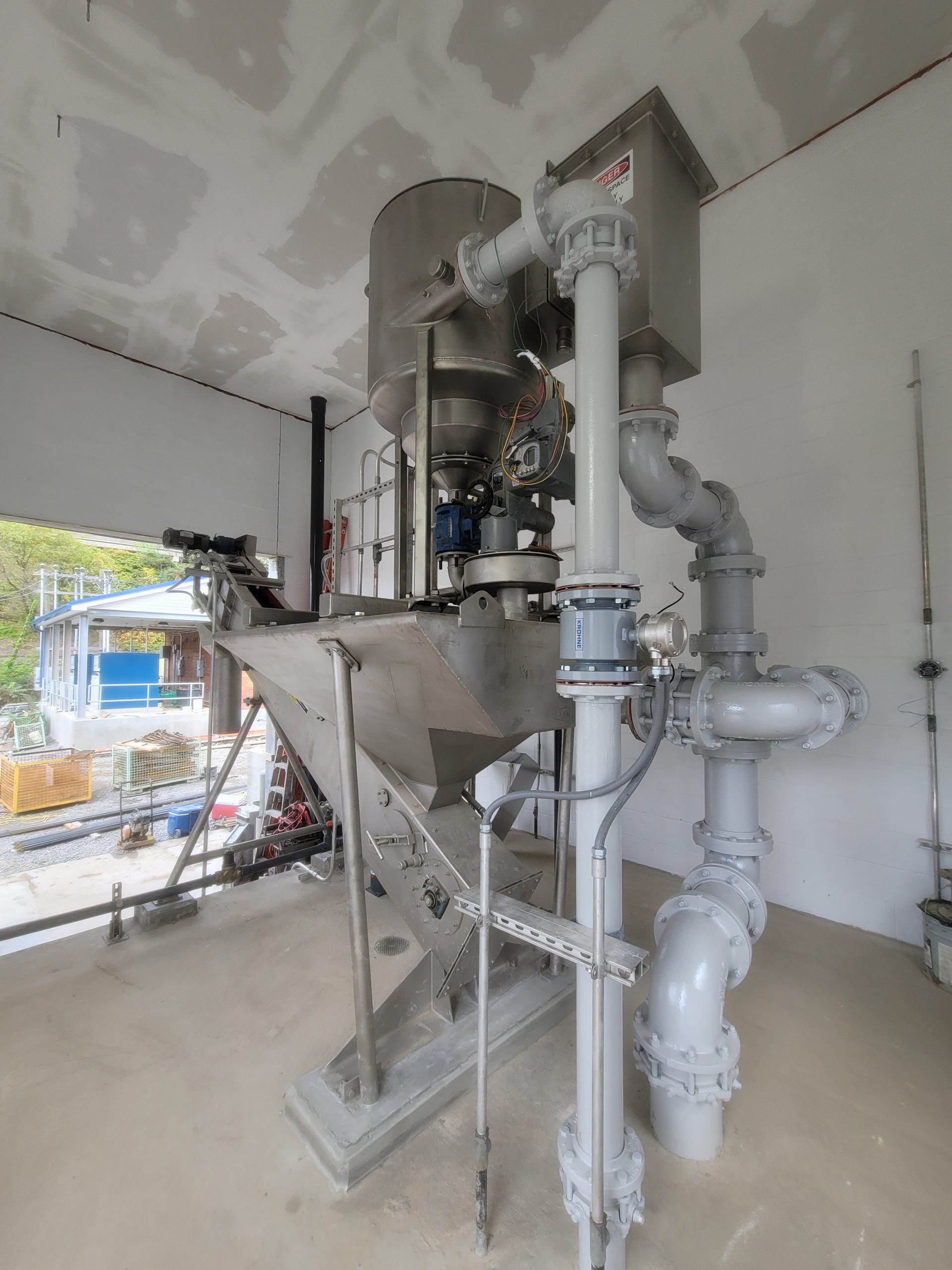 The concentrated slurry is collected in the chamber at the bottom of the unit. Periodically fluidizing water is added and the grit is purged by gravity in a grit slurry out of the unit. The slurry discharged is clean and ready for dewatering. The water containing the volatile solids exits the top and returns to the WWTP for treatment.