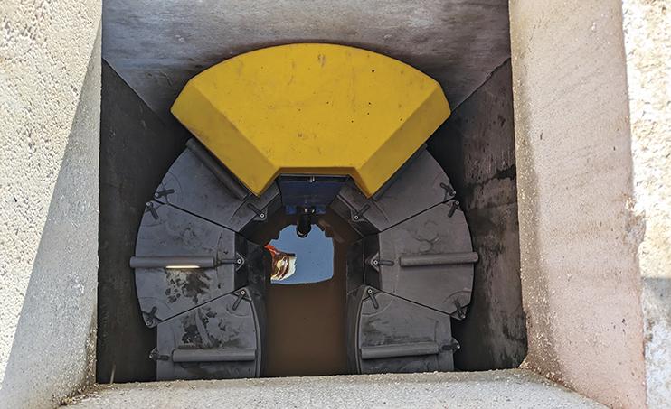 - Stormwater enters the chamber via an inlet pipe or inlet grate and fills the chamber, as flow is directed up through the angled screen and Filter Modules.